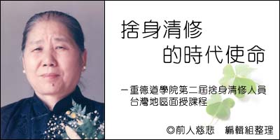 我們在一貫道捨身的使命,是接受 老 的恩、師尊師母的德,然後將惡濁世界變成佛國淨土,這是我們的使命。現今,人倫的思想和道德的觀念可以說已經沒有了,但是我們的使命就是要把它變成佛國淨土,這一點希望在我們每一位捨身人的大愿之下,跟我們接受的責任之下,一定要完成使命。如果不完成,失掉這樣好的機緣,我們來這一世實在太可惜了。所以大家不要有分別心,不要有煩惱心,不要有思想上的困擾,世界這麼大,將這個惡濁的世界化為淨土,就靠我們的能力、使命,達到完成。