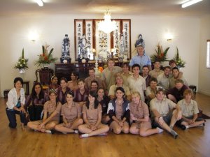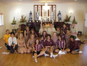 十二日早上第一班的學生就到了。剛開始,為了讓大家體會佛堂的禮節與文化,布媽媽建議大家乾坤分班,在佛堂大廳坐下來,後又因學校老師要求簡單的解說,後學就從佛位開始,向學生們解說了 燈、仙佛的故事等等,再逐漸的把「五倫」為主軸帶進談話之中,談如何將「五倫」運用到日常生活、發揮到身邊週遭的朋友、老師等等。在交流的過程中,一直採用雙方互動的方式,由雙方互相問問題並解說。最後,又保留了約十五分鐘的時間讓學生問問題。諸如: