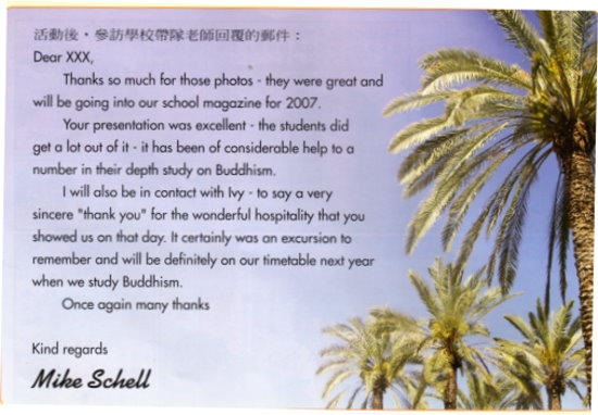 「那裡有一所中學在十二號那一天,會有二班學生到佛堂來了解我們中華文化及佛堂的精神。每班停留的時間約一小時左右。我已請示了前人,前人慈悲說以『五倫』為主題為那些學生解說。我也知會了您那裡的點師,你就快快的去準備一下吧!」洪點師慈悲說。