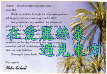 「那裡有一所中學在十二號那一天,會有二班學生到佛堂來了解我們中華文化及佛堂的精神。每班停留的時間約一小時左右。我已請示了前人,前人慈悲說以『五倫』為主題為那些學生解說。我也知會了您那裡的點師,你就快快的去準備一下吧!」洪點師慈悲說。more...... |